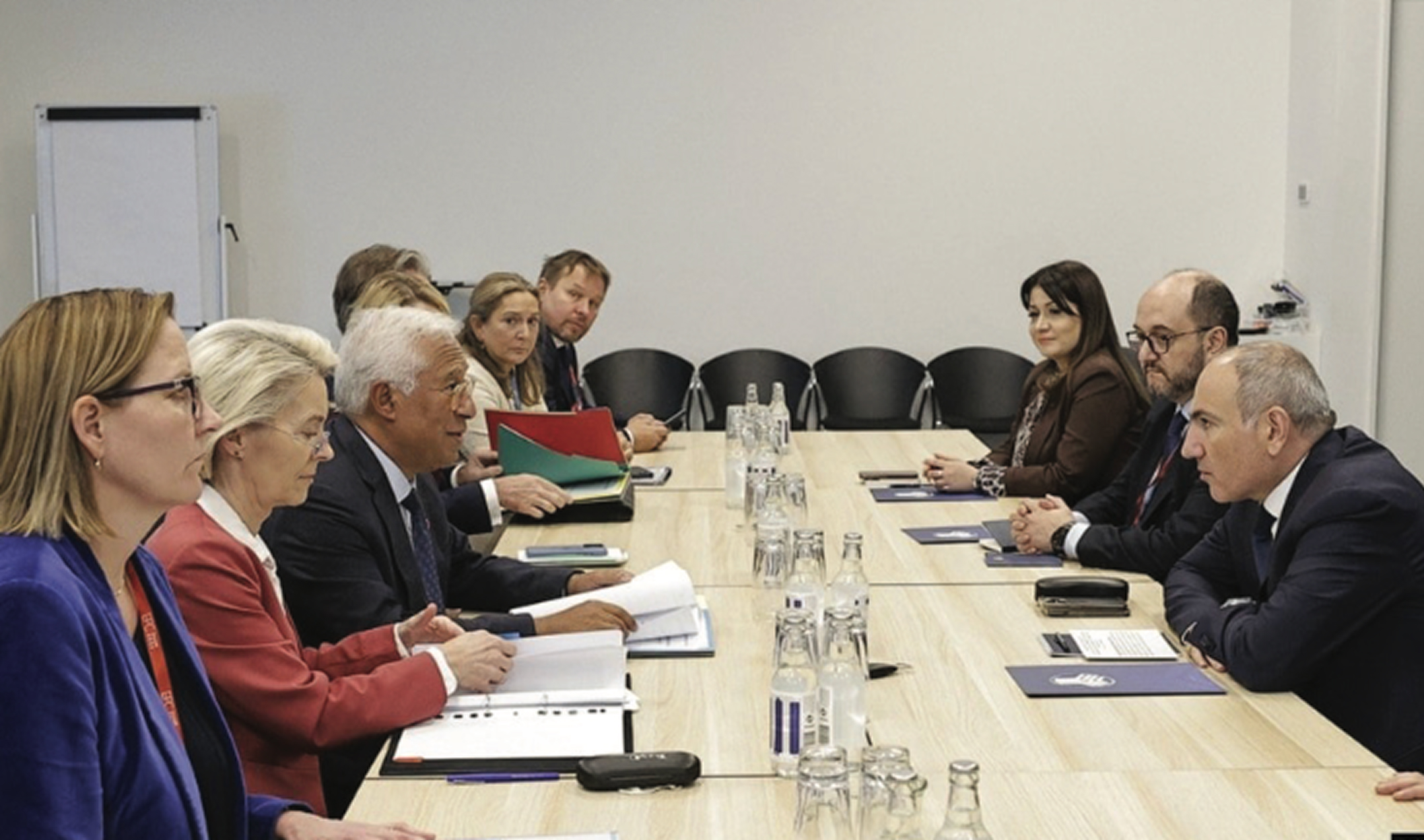 The European Union’s two top officials hailed recent U.S.- brokered agreements as a “crucial step” towards a resolution of the Armenian-Azerbaijani conflict when they met with Prime Minister Nikol Pashinian in Copenhagen on Thursday. European Council President Antonio Costa and European Commission President Ursula von der Leyen held talks with Pashinian on the sidelines of the latest European Political Community summit in the Danish capital. “We congratulated Armenia on the landmark progress with Azerbaijan in Washington, facilitated by [U.S. President Donald] Trump,” Costa and von der Leyen said in identical X posts. “A crucial step towards peace and stability in the region.” Pashinian has repeatedly stated that peace has already been established between Armenia and Azerbaijan as a result of his August 8 talks with Azerbaijani President Ilham Aliyev hosted by Trump. The latter has likewise claimed to have “helped settle the war” between the two South Caucasus states. The Washington summit resulted in the initialing of an Armenian-Azerbaijani peace treaty. Also, Pashinian pledged to give the United States exclusive rights to a transit corridor that would connect Azerbaijan to its Nakhichevan exclave through Armenia’s strategic Syunik province. The corridor is to be named the Trump Route for International Peace and Prosperity (TRIPP). An Armenian government statement on the Copenhagen meeting said Pashinian discussed with the EU leaders the results of the August 8 summit and “implementation of the TRIPP project.” It gave no details. Costa and von der Leyen also described Armenia as a “key partner for the EU” and said they are “determined to deepen our cooperation.” They again said nothing about Yerevan’s declared plans to seek to eventually join the EU. Amid heightened tensions with Russia, Pashinian’s ad Denmark – The top European Union officials meet with Armenian Prime Minister Nikol Pashinian in Copenhagen, October 2, 2025. ministration enacted this spring a law declaring the “start of a process of Armenia’s accession to the European Union.” EU foreign policy chief Kaja Kallas hailed the law during a June visit to Yerevan. But she did not say whether the South Caucasus nation can realistically hope to join the 27-nation bloc in the foreseeable future. Costa and von der Leyen also made no mention of such a possibility in a joint statement with Pashinian issued after their previous meeting held in Brussels in July. Ignoring repeated warnings by Russia, Pashinian said on September 20 that his government will step up “efforts aimed at Armenia’s accession to the European Union.” Russia’s Prime Minister Alexei Overchuk reiterated earlier that Armenia risks losing its tariff-free access to the Russian market and other economic privileges if its leadership keeps drifting to the EU. According to official statistics, Russia accounted for over 35 percent of Armenia’s foreign trade in the first half of this year, compared with the EU’s 12 percent share.