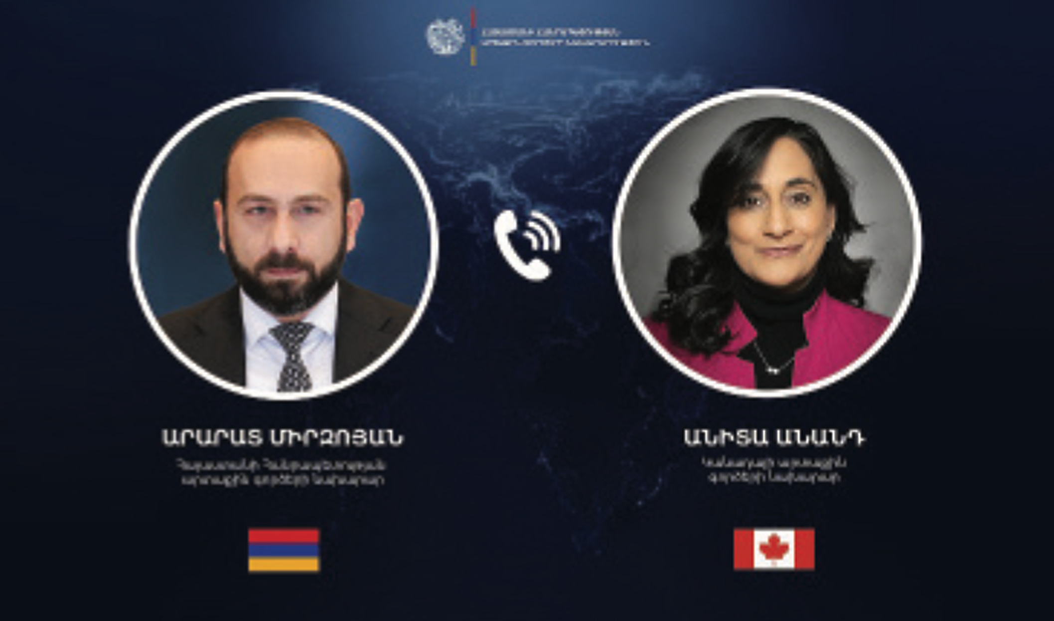 Minister of Foreign Affairs of Armenia Ararat Mirzoyan had a telephone con- versation with the Minister of Foreign Affairs of Canada Anita Anand. The interlocutors discussed the situation in the Middle East, with both sides emphasizing the importance of close cooperation in crisis situations. Minister Mirzoyan stressed the im- portance of reaching a resolution of the current situation through negotiations and a peaceful settlement. Minister Mirzoyan expressed Ar- menia’s readiness to assist, as neces- sary, in the evacuation of Canadian citizens through the territory of the Re- public of Armenia.