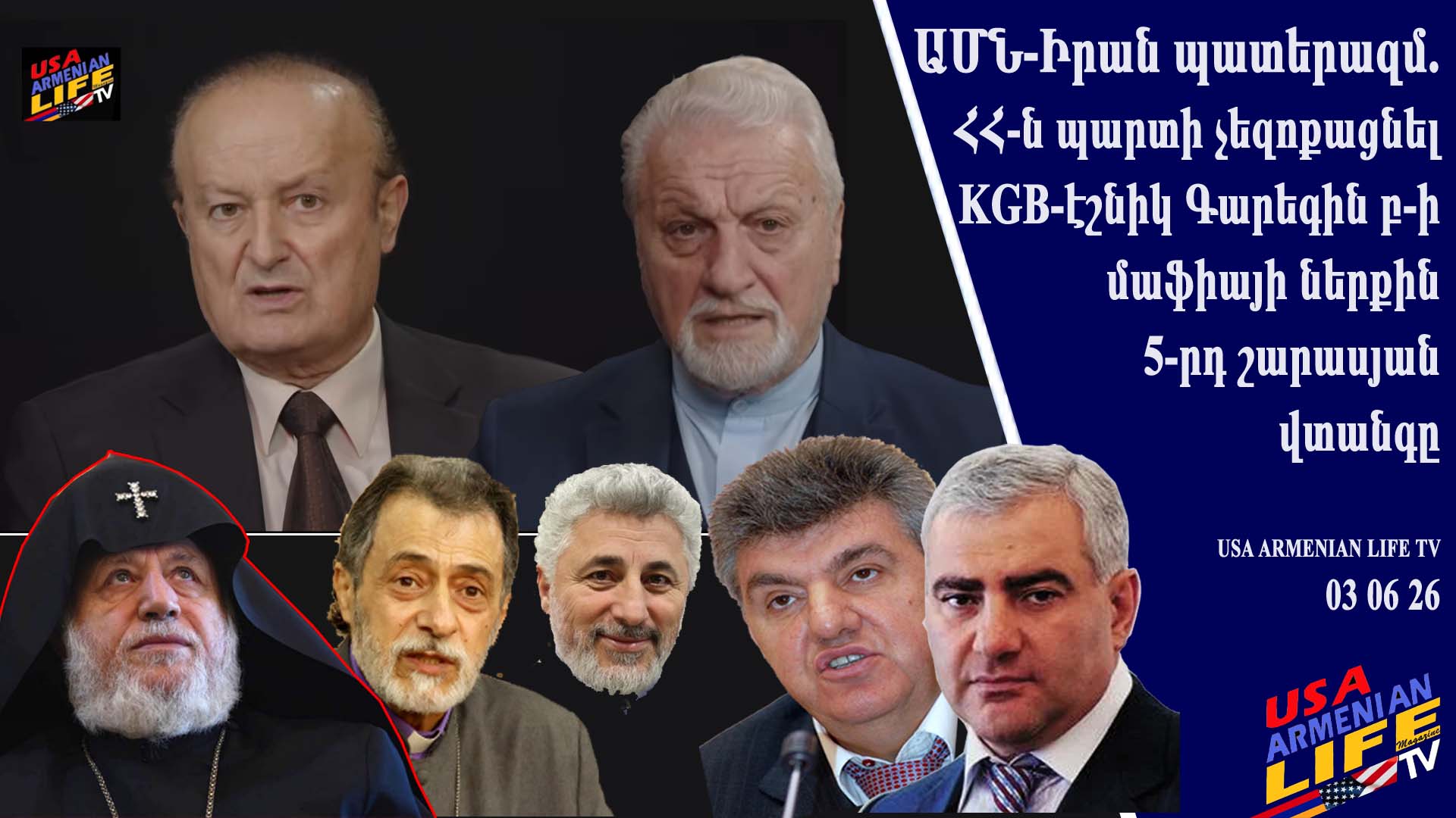 Ստորեւ կը ներկայացնենք 2026թուականի 6 Մարտի USA ARMENIAN LIFE հեռուստատեսայինհաղորդաշարինարտաթագրուած «թեքսթ»ը՝ «ԱՄՆ-Իրանպատերազմ. ՀՀ-ն պարտիՔաԿէՊէ-իշնիկ Գարեգին Բ.-ի մաֆիայիներքին 5րդ շարասեանվտանգըչէզօքացնէ»։